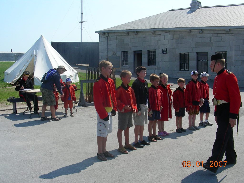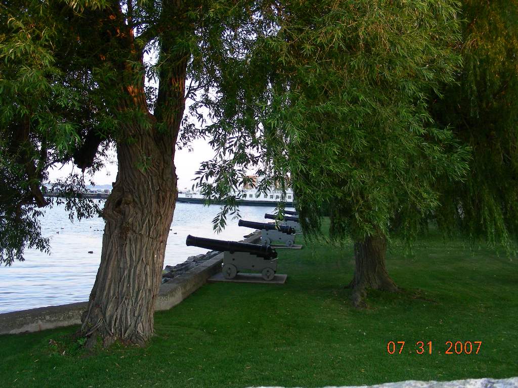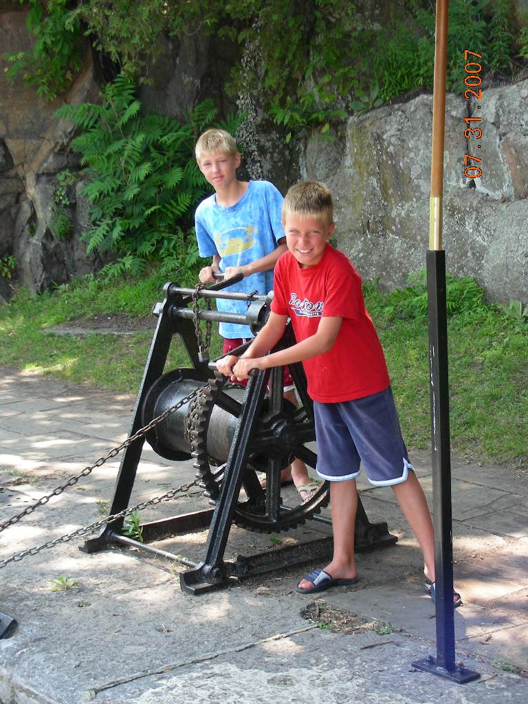 We woke up at 8:30am. We had breakfast, than walked across the bridge to the Royal Military Academy of Canada. There we ask how to get to Fort Henry but they led us to fort Fredrick. We finally got to Fort Henry. In the fort we saw many different guns of the 19 century. There was a jail so we put curious George in it. Anton and Eugene signed up as recruits, where we were treated like slaves. Alright on the way back we bought 4 pounds of potatoes and ice cream. Than we sailed off at 12:30pm. We went reached the next lock in an hour, there was four after we pasted the four locks we ate lunch. Then we swam in the water and ate some ice cream. We sailed on the River Styx, than at the next lock we docked and stayed there for the night. Anton, Eugene and Natasha slept in the tent. |