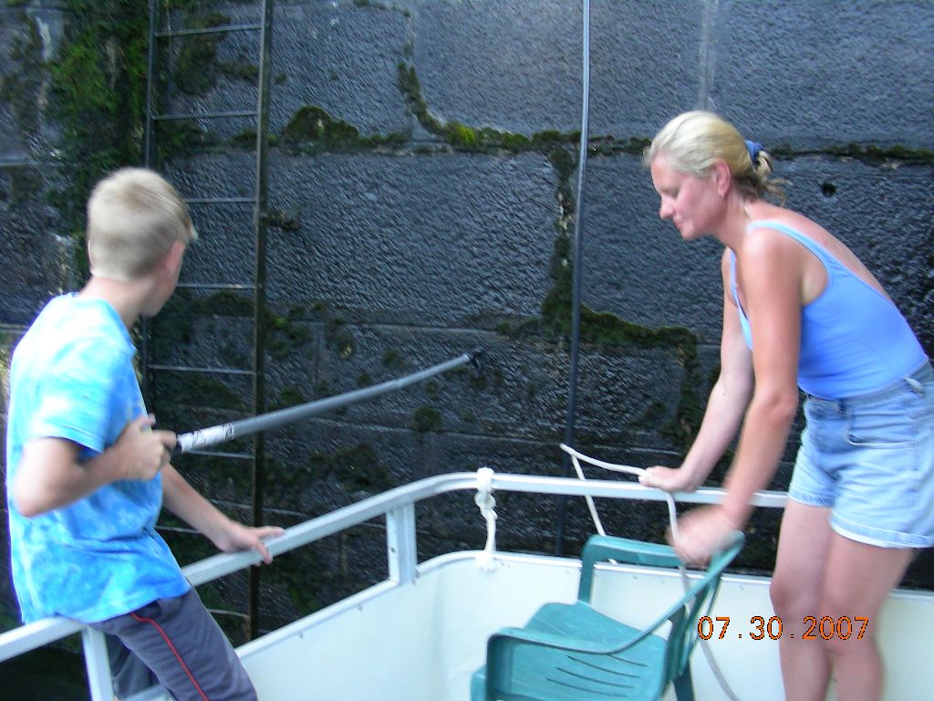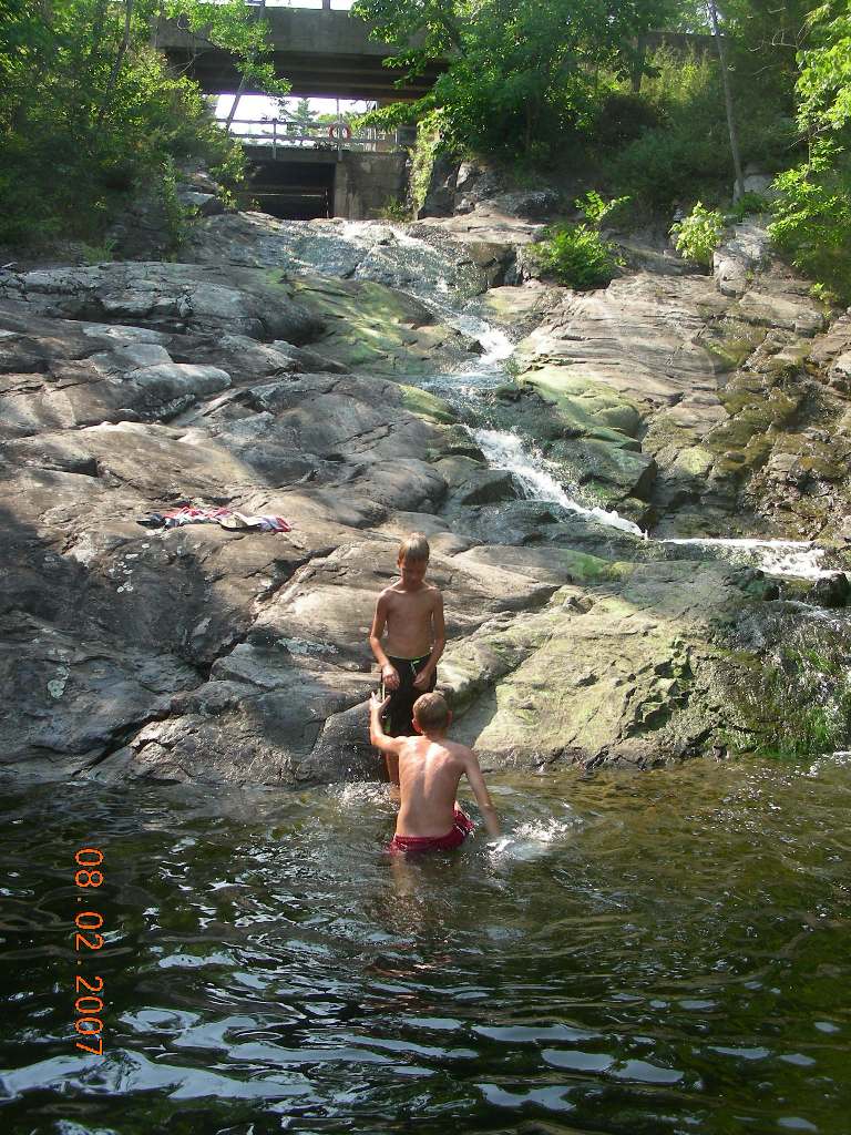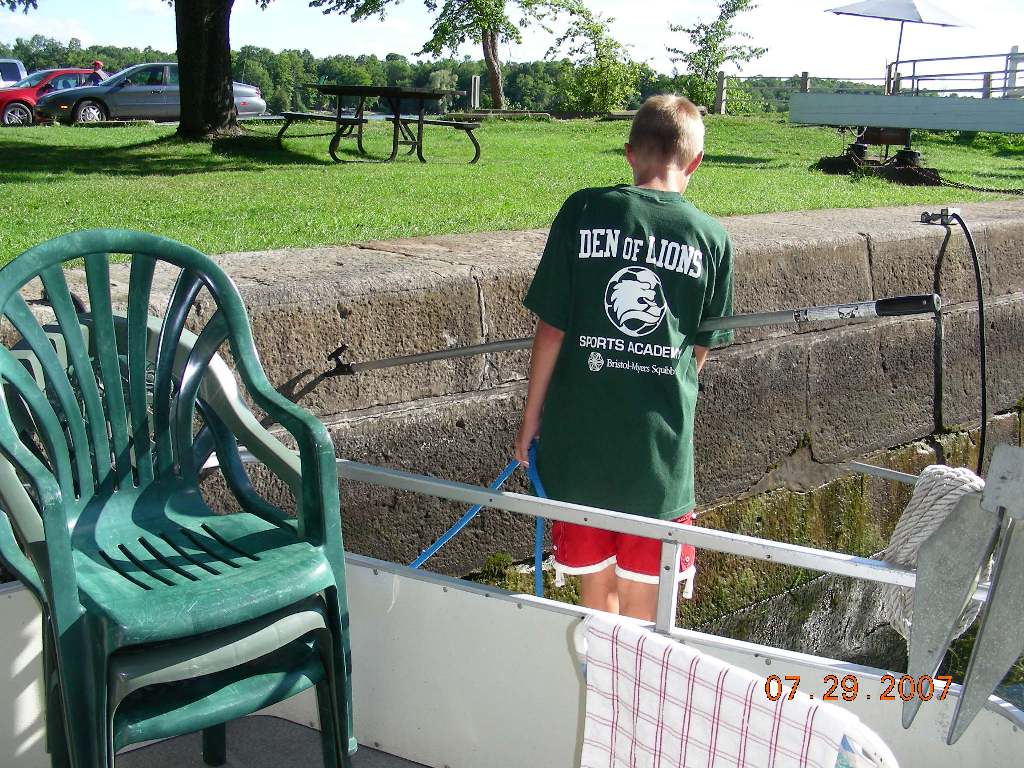 Everybody woke up at 7:30am except for Anton (he woke up at 8:00am). We had pancakes and eggs for breakfast. Docked in front of us was the boat “Blue Skye”. They had an emergency. The captain’s wife needed to go to a dentist. At 9:30am we left the dock and passed the lock. At 10:30am we stopped and let our boat drift in Clear Lake where we swam. At 11:15am we rode on to Chaffey’s lock, which we arrived at 12:15pm. At 3:00pm we drifted in Ell’s Bay. We swam and after that Anton, Natasha and Eugene rowed to get lily pads. We also ate there: chicken noodle soup with broccoli, cauliflower and peas in it, chicken with spaghetti and ice cream for dessert. We left Ell’s Bay at around 5:00pm. We rode on to Jones Fall lock. They told us to wait there for 45 minutes because it was a quadruple lock and we had to wait for the other boat to get out. There, we swam by the waterfall and we visited the lockmaster’s house. At around 7:00pm we passed Jones Fall and we needed a place to stay. Nobody wanted to pay to stay in a marina so we decided to stay in Morton Bay. We arrived at 7:30pm and we “docked” in a small inlet that we found. Our “neighbors” played on the bagpipe. Everybody was scared but at the end we made it. We ate there and we went to sleep. |