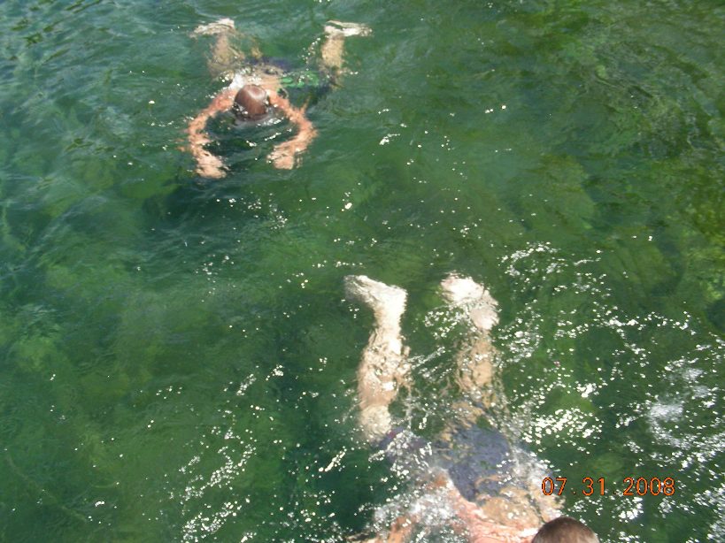 We explored around the island and picked mushrooms. Then we came back and went for a swim. We had jumped from the top layer