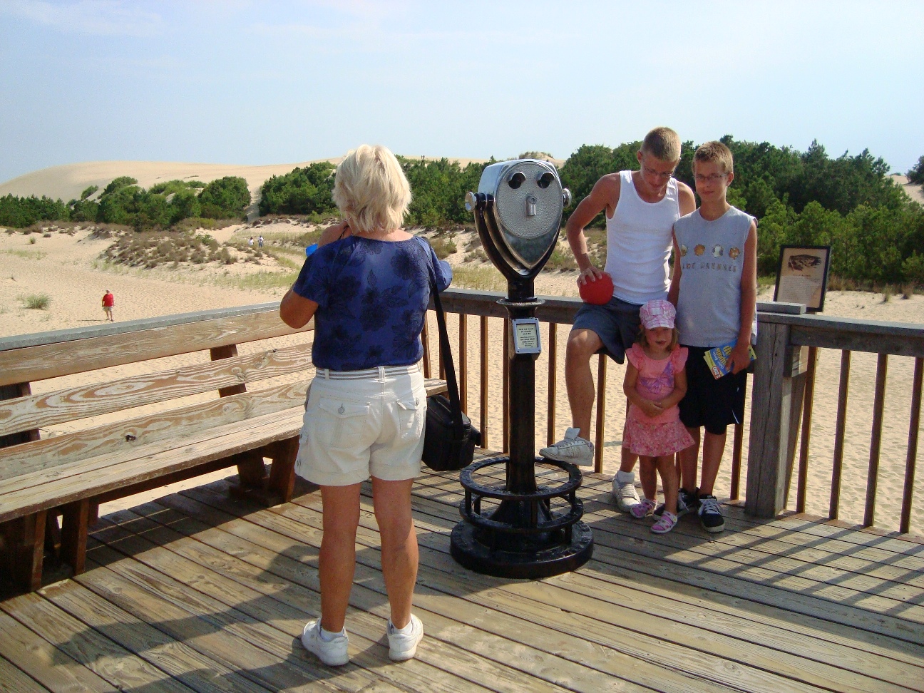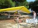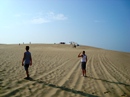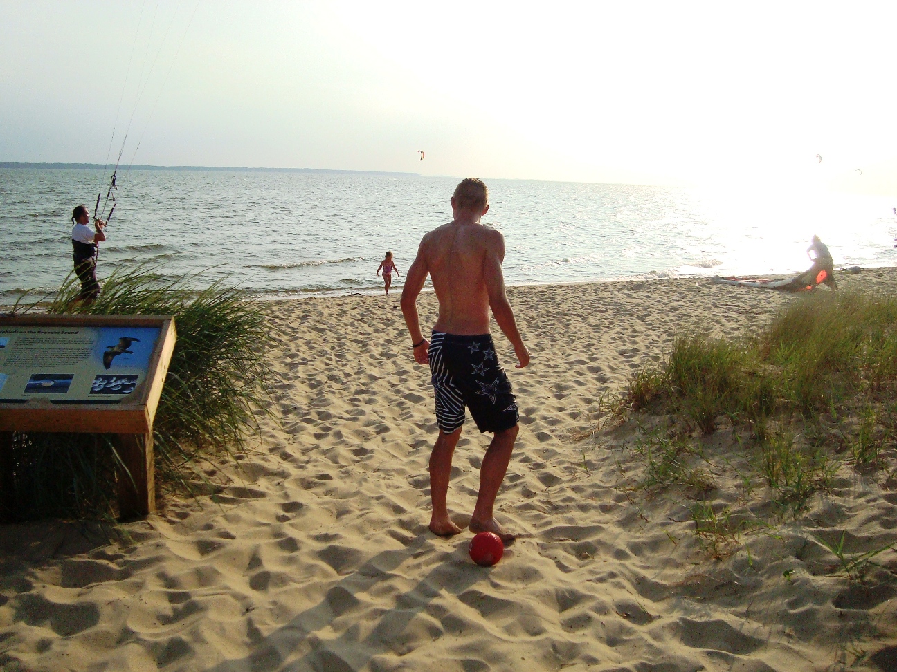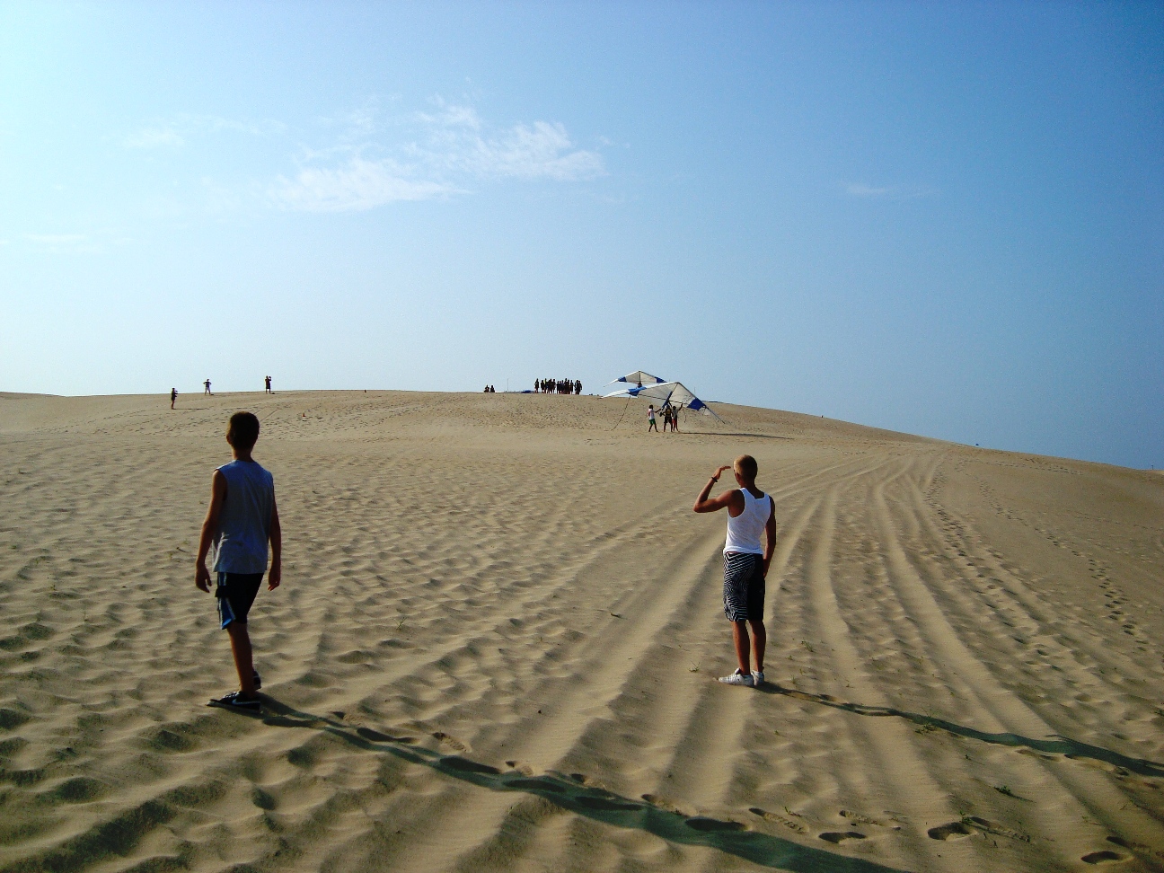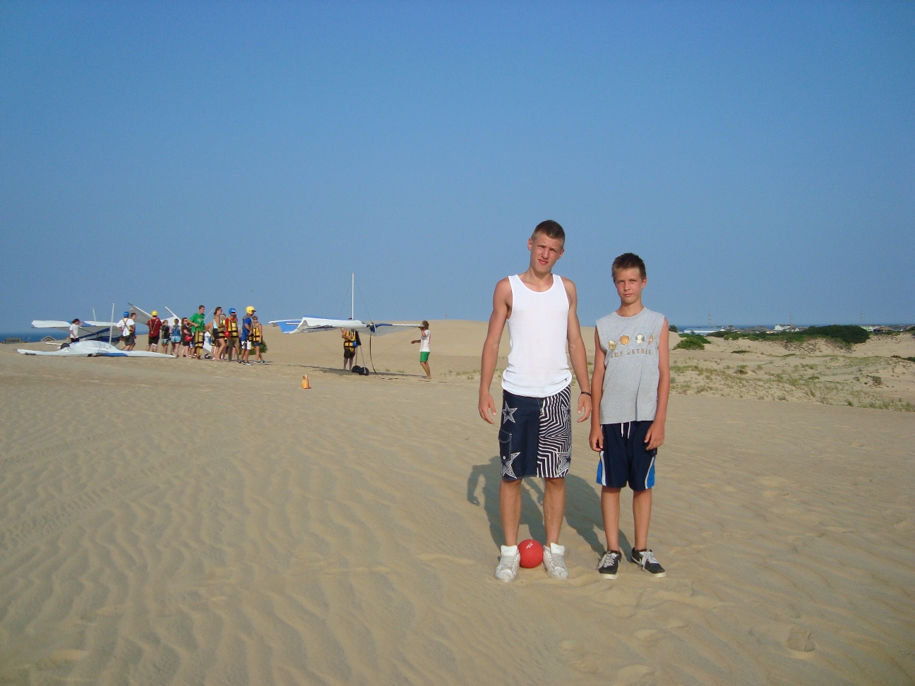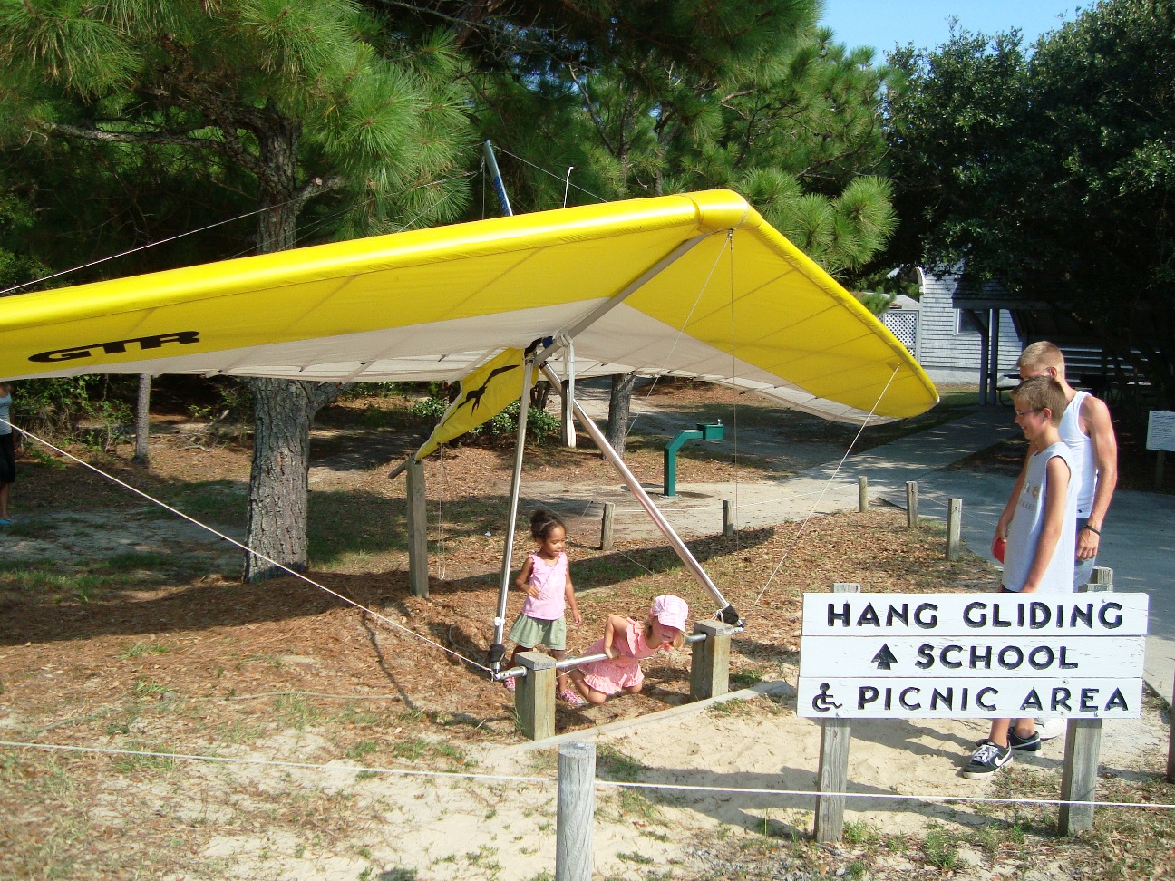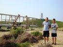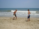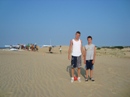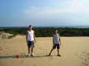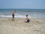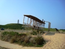 The park's visitor center features a museum about the cultural and natural history of the park, including sand dunes, plants and wildlife, weather, pirates and local maritime history. A gift shop run by the Friends of Jockey's Ridge is also located in the visitor center. The ridge area is accessed either from the back deck of the visitor center or the parking lot via a 350-foot-long (110 m) boardwalk. Kitty Hawk Kites, the world's largest hang gliding school, also provides concessionaire hang gliding lessons in the park. Their office is located directly behind the park's visitor center. We watched several unsuccessful attemts of school graduates to take off, and decided not to take their lessons. Instead we tried to build our own kite on the beach, but the results of test-flight were similar: about 8 seconds of flight. Then we remembered that first Wright Brothers' Flight lasts only 12 seconds and decided that it is not bad for us at all. |