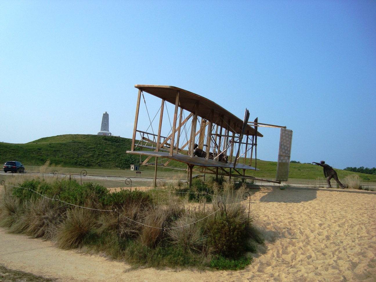 The Wright Brothers National Monument commemorates the historic flights, and First Flight Airport is a small, general-aviation airfield located there.