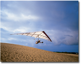 Shifting maritime winds blow billions of grains of sand in different directions, constantly changing both the shape and size of the dune. Why doesn't the sand blow away? In the winter, the winds usually blow out of the northeast and in the summer out of the southwest; therefore, the sand is constantly blown back and forth. Also, the dunes' tiny sand particles hold moisture throughout the year. The sun dries the top layer of sand. But, just below this layer, the sand stays wet. The high winds from northeasters blow the top, dry layer off, but the wet layer below stays put. The Roanoke Sound is a shallow, brackish, estuarine body of water that separates Bodie Island from Roanoke Island. It remains shallow due to the same forces that created the ridge: winds blow sand from the dune area into the sound. It is able to act as a hatchery for many types of both freshwater and saltwater fishes due to its mostly calm waters. Croakers, shrimp, striped burrfish, pipefish, blue crabs, and seahorses have all been documented near the park. Many types of shorebirds are also present along the sound. Ospreys are one of the more fascinating sights during warmer months in the area. This is the perfect place for windsurfing, paragliding and kitesurfing. |