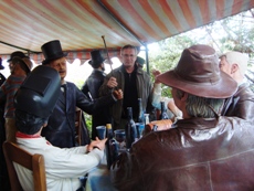 A dashing character in period costume brandishes his cane and addresses those at the table asking, 'Were you invited?'