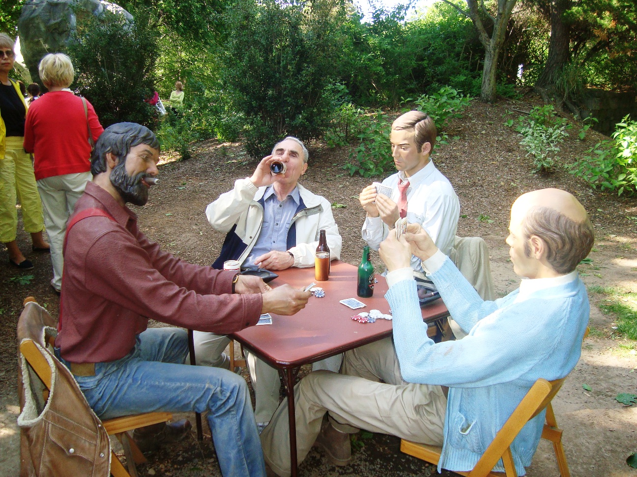 Joined in convivial conversation are realistic representations of sculptor Johnson himself with artists Bill Barrett, Red Grooms, and Andrzej Pitynski.