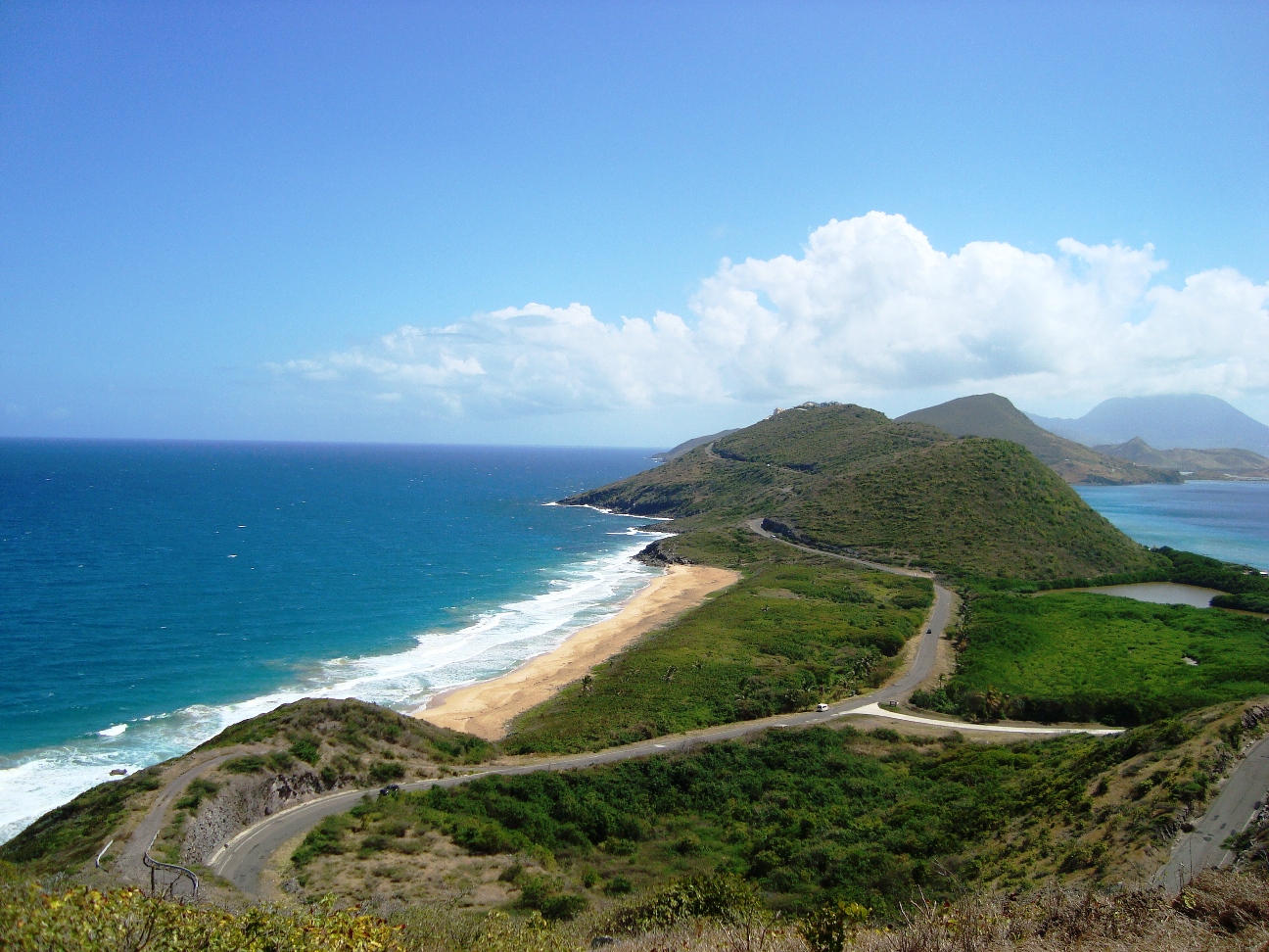 The smaller island of Nevis lies about 2 miles (3 km) southeast of St. Kitts, across a shallow channel called "The Narrows".