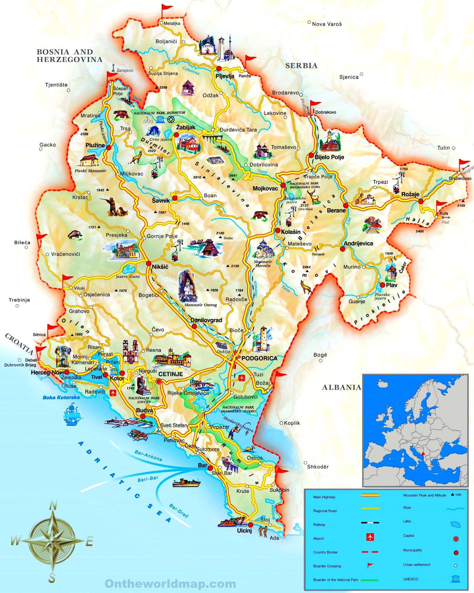 The mausoleum of Peter II Petrovic-Njegos, the sightseeing platform, as well as the birthplace and home-museum of the Petrovic-Njegos royal family is located there. On the road to the mountaintop you can enjoy breathtaking views to the mountains and the Bay of Kotor, located at the feet of Kotor and Cetinje.