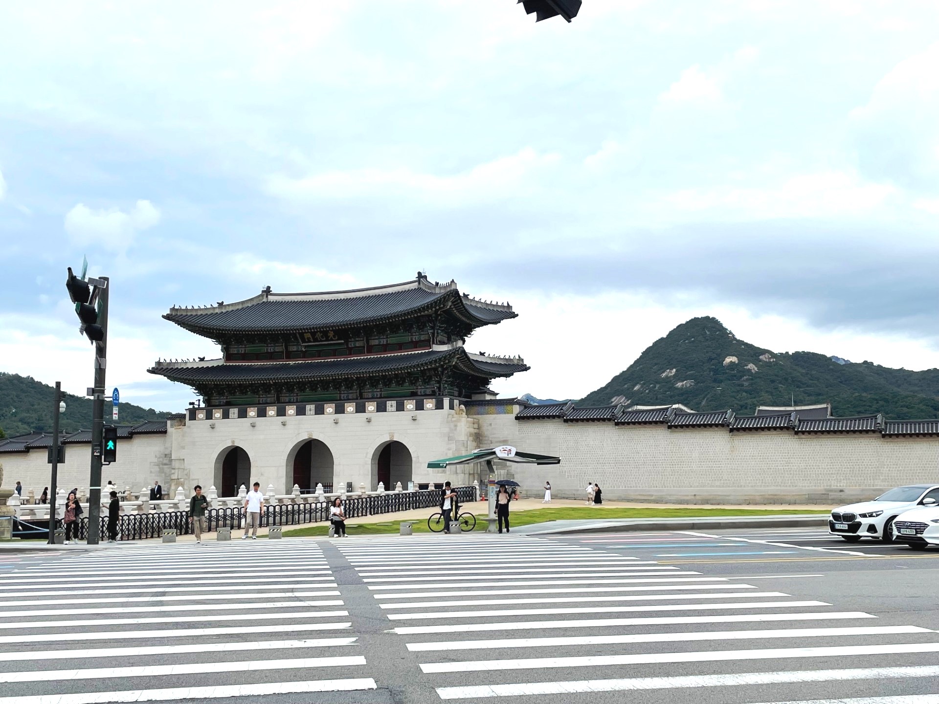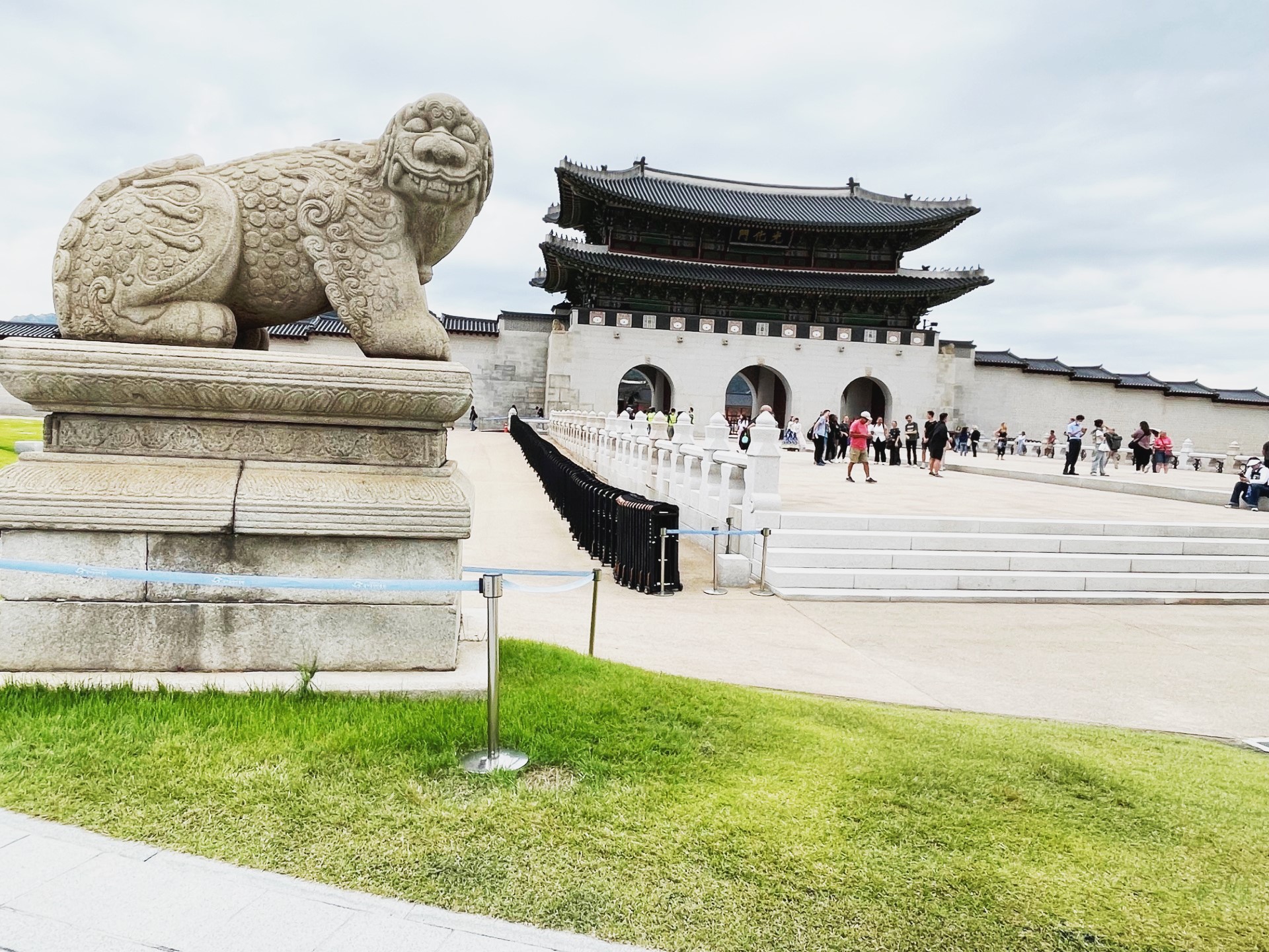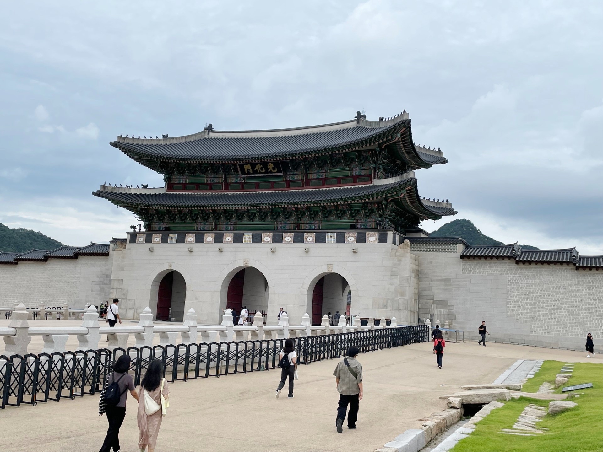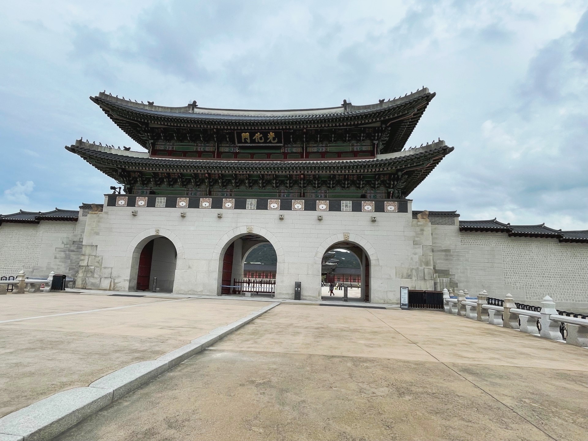 In the photo, the gate’s imposing stone base supports a graceful two-tiered wooden pavilion, crowned with traditional dark gray roof tiles that curve elegantly upward. The three red wooden doors symbolize royal authority and serve as the main passageways into the palace grounds. Above the central arch, a calligraphy plaque inscribed with the characters “光化門” (Gwanghwamun) proclaims its historical importance.