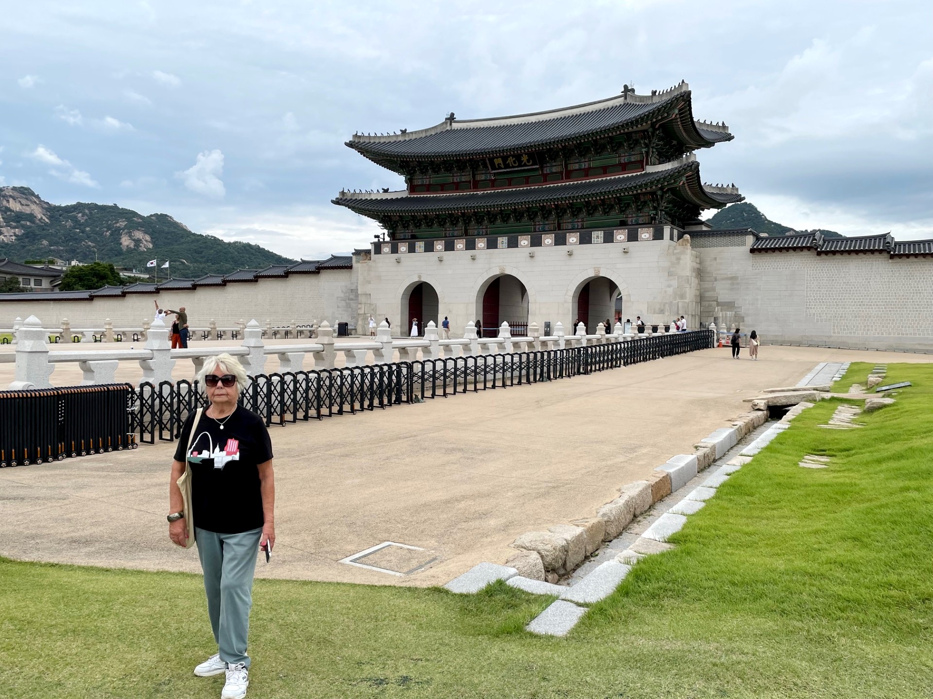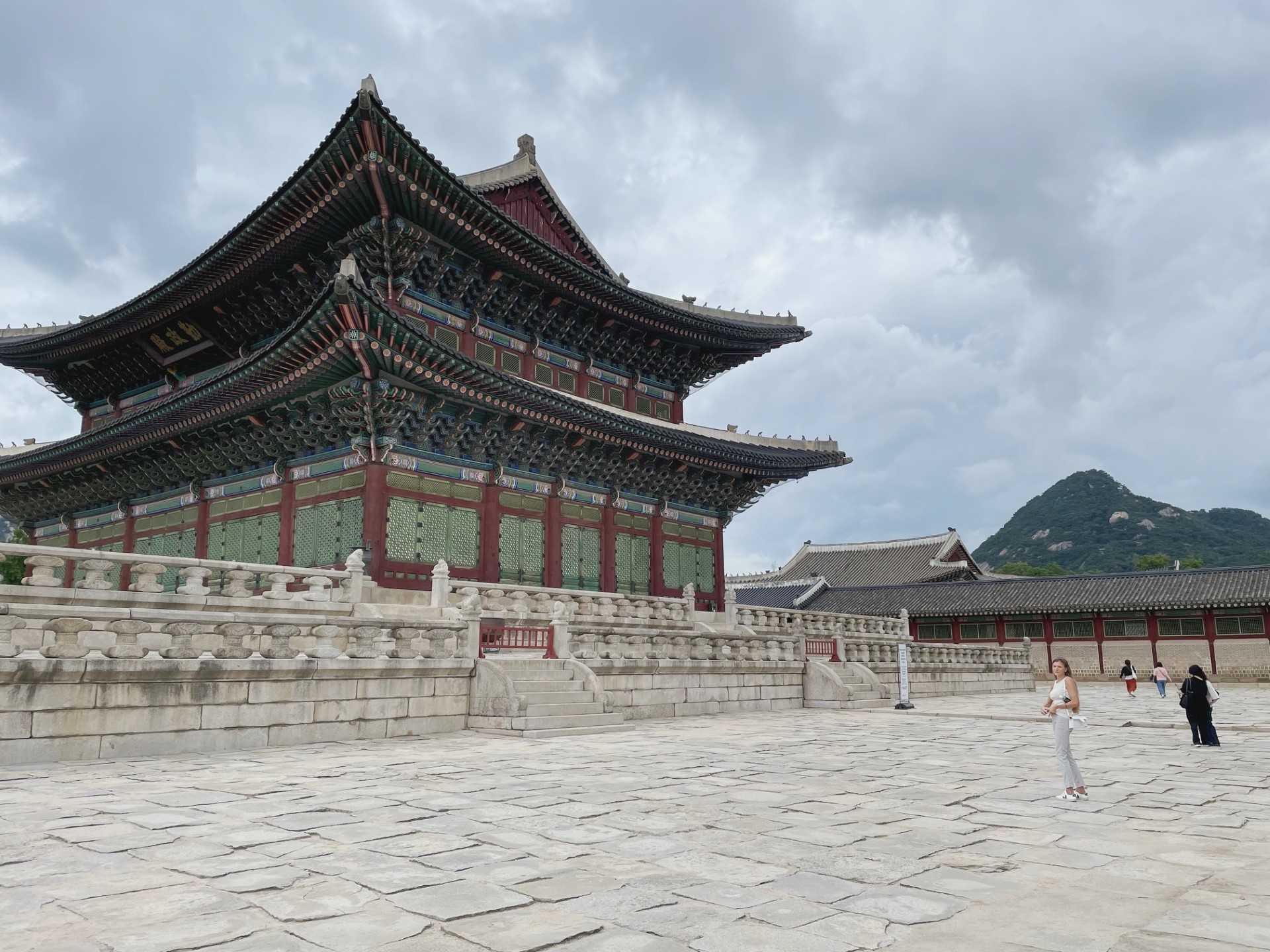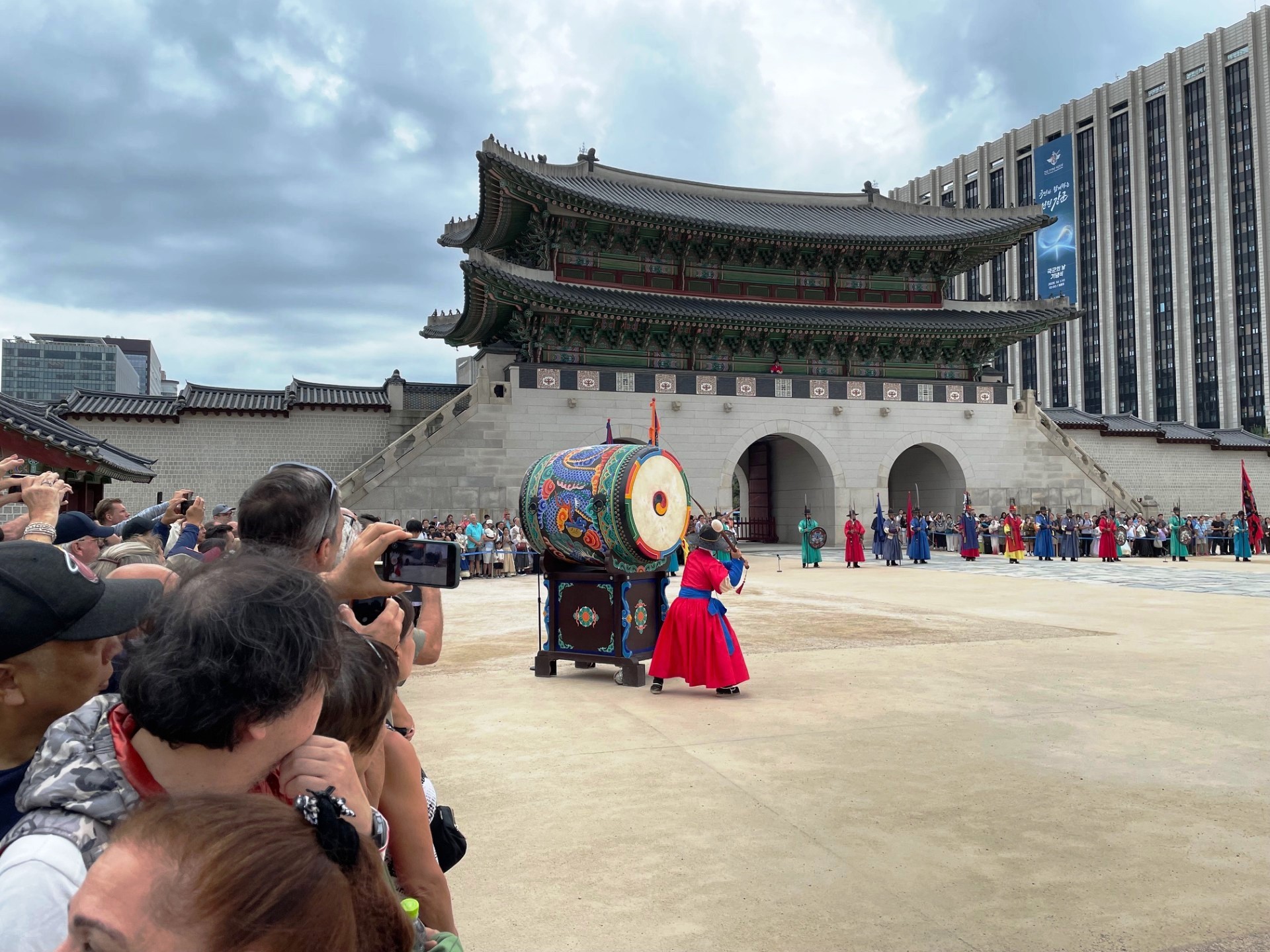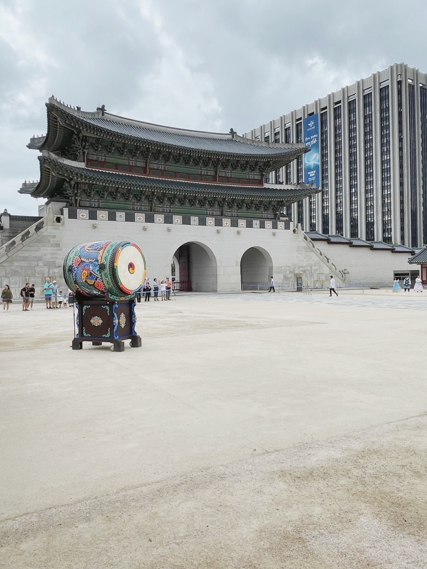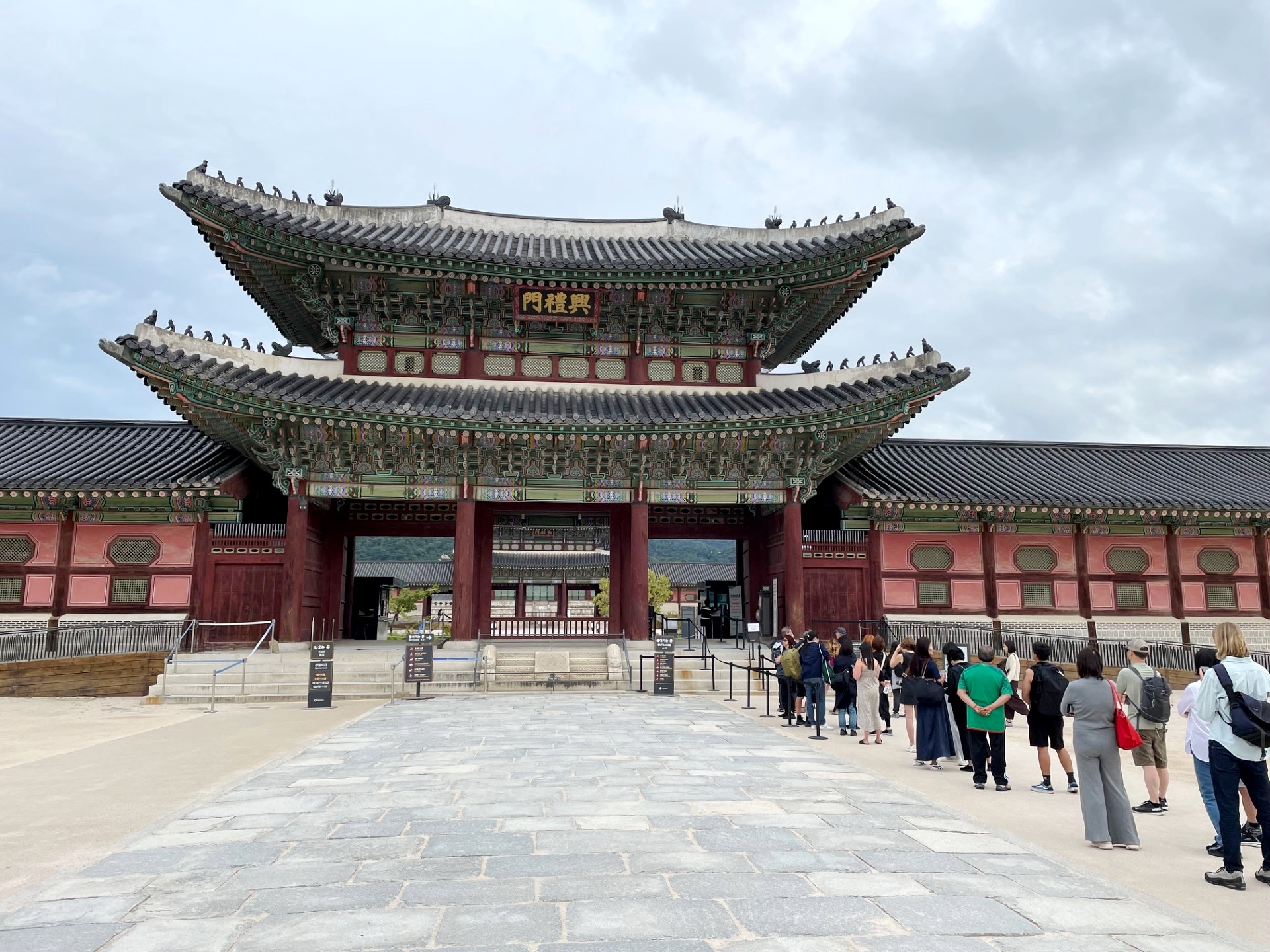 In the photo, the gate’s imposing stone base supports a graceful two-tiered wooden pavilion, crowned with traditional dark gray roof tiles that curve elegantly upward. The three red wooden doors symbolize royal authority and serve as the main passageways into the palace grounds. Above the central arch, a calligraphy plaque inscribed with the characters “光化門” (Gwanghwamun) proclaims its historical importance.