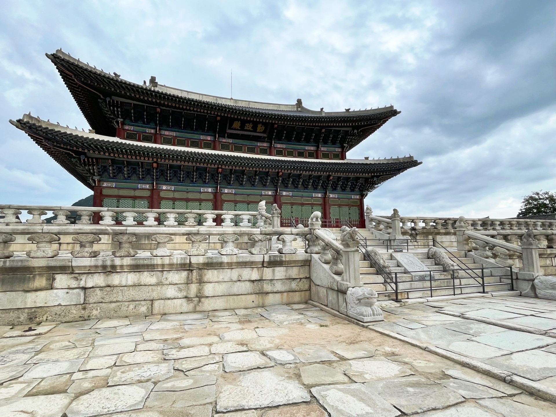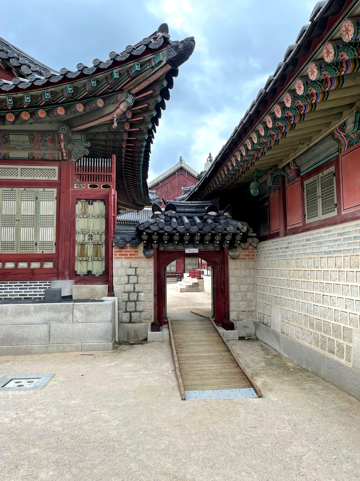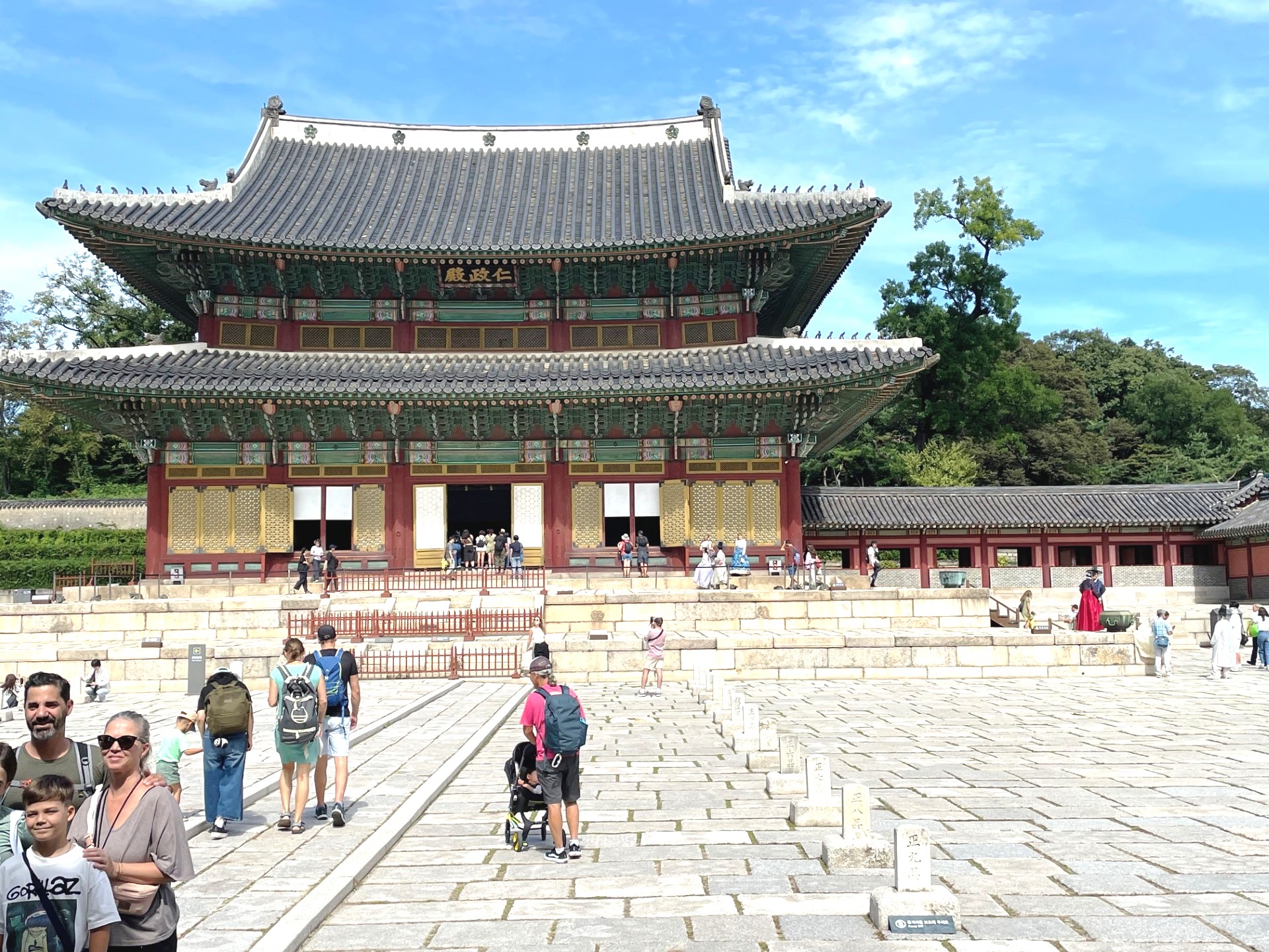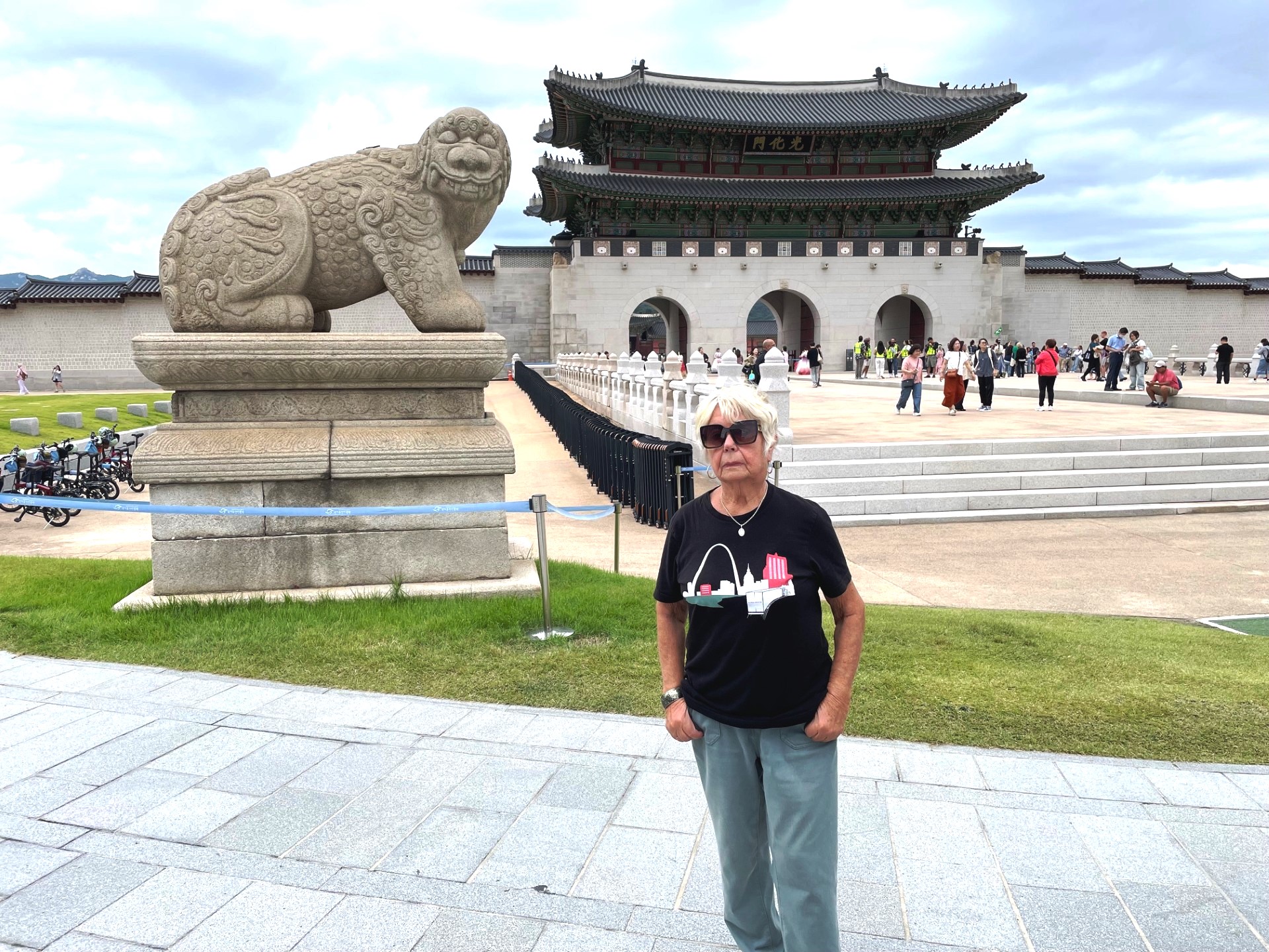 In the photo, the gate’s imposing stone base supports a graceful two-tiered wooden pavilion, crowned with traditional dark gray roof tiles that curve elegantly upward. The three red wooden doors symbolize royal authority and serve as the main passageways into the palace grounds. Above the central arch, a calligraphy plaque inscribed with the characters “光化門” (Gwanghwamun) proclaims its historical importance.