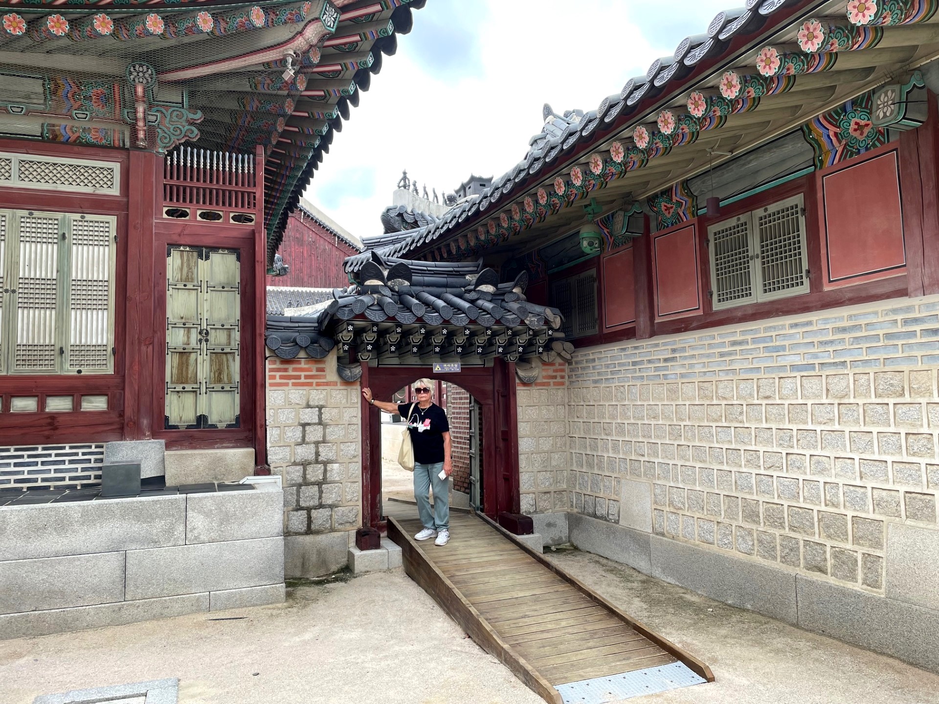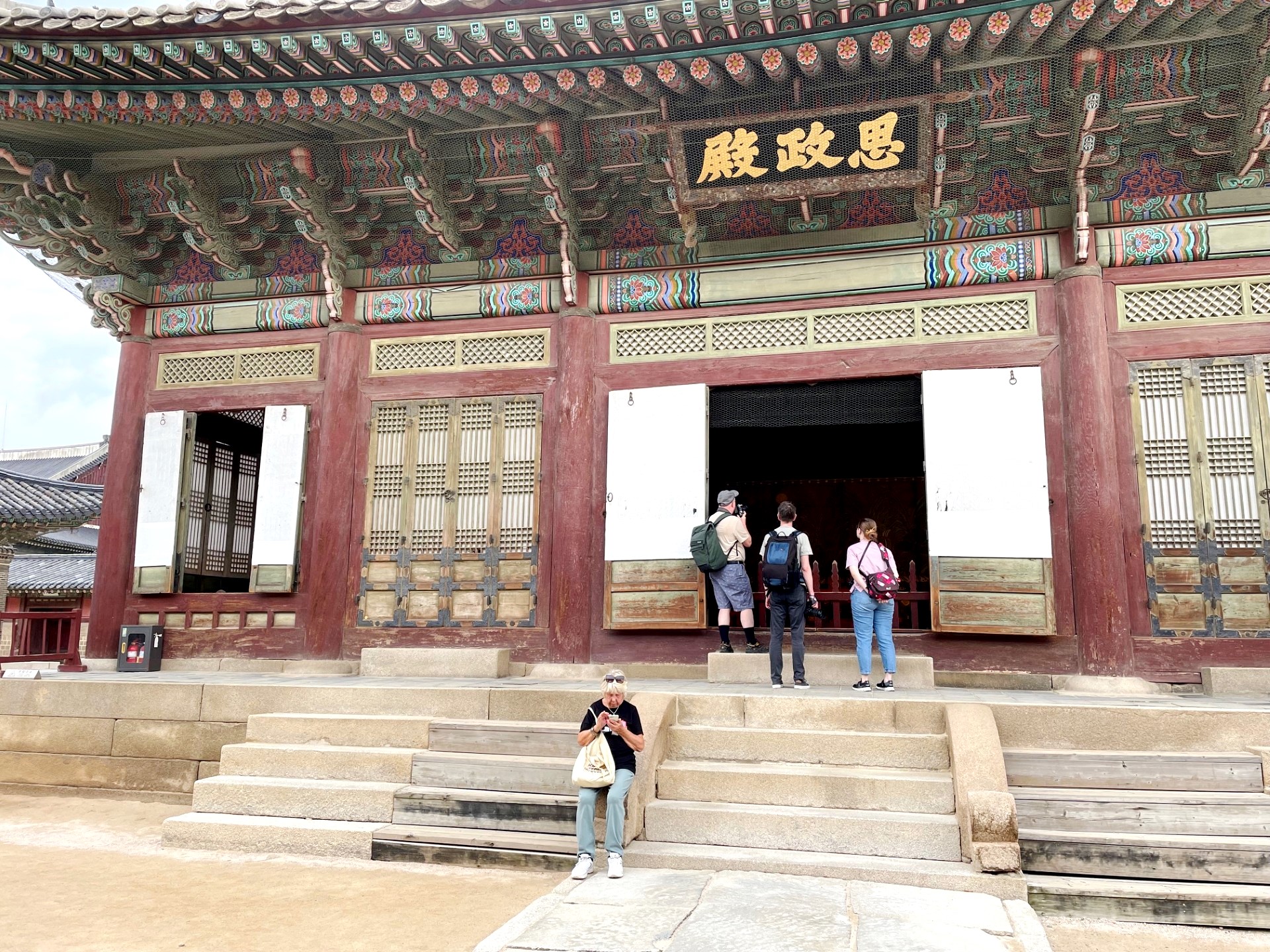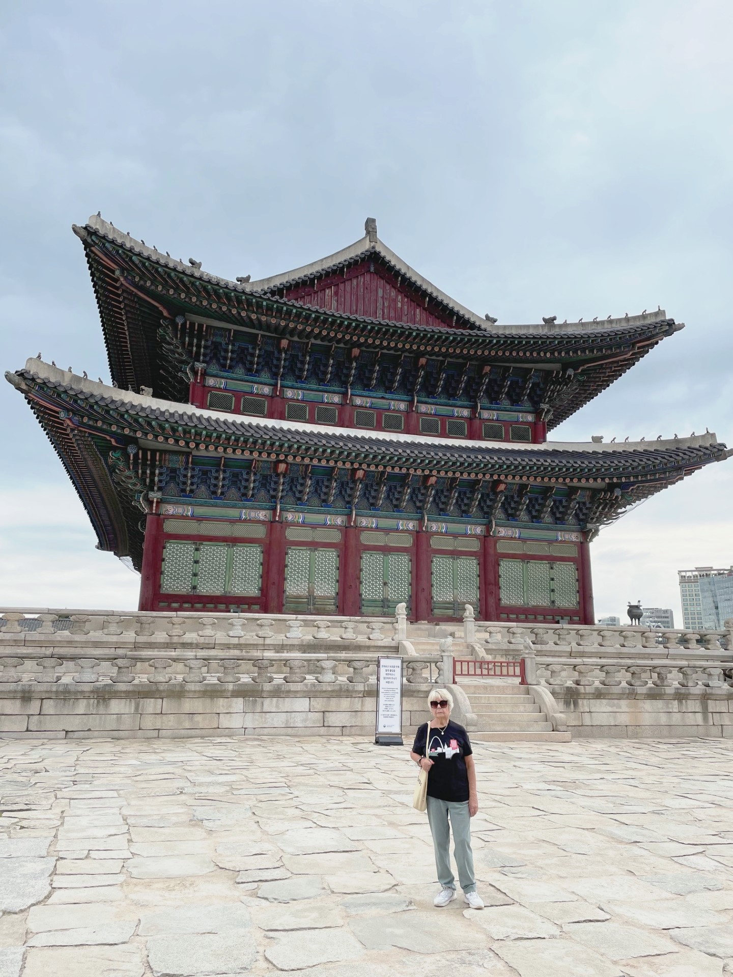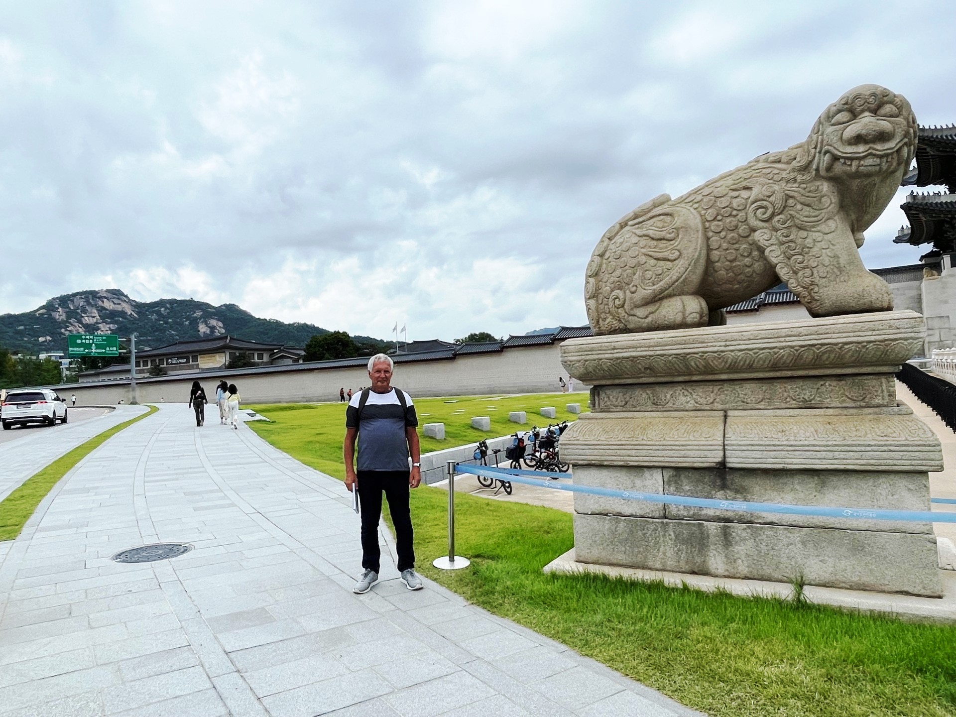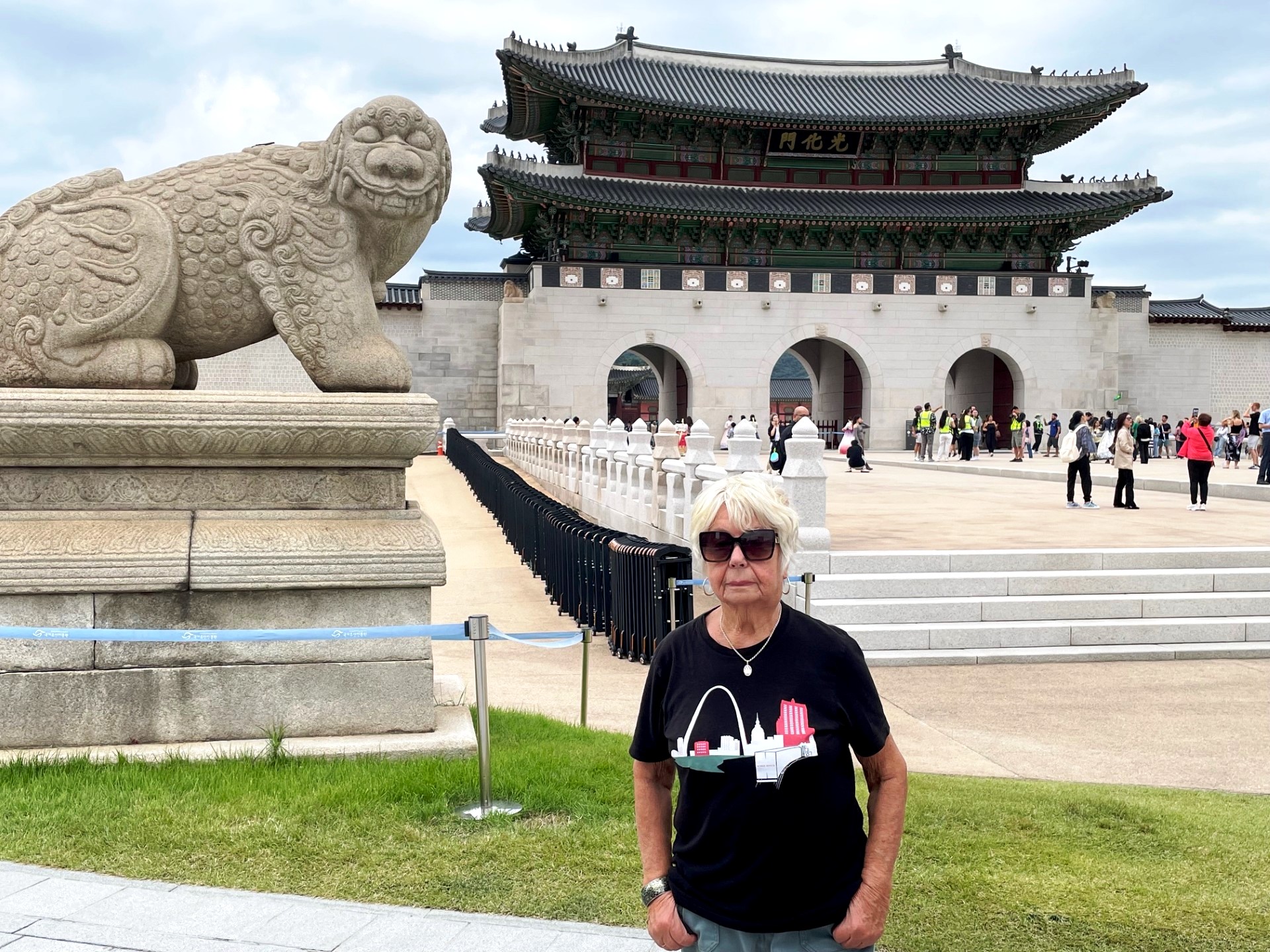 In the photo, the gate’s imposing stone base supports a graceful two-tiered wooden pavilion, crowned with traditional dark gray roof tiles that curve elegantly upward. The three red wooden doors symbolize royal authority and serve as the main passageways into the palace grounds. Above the central arch, a calligraphy plaque inscribed with the characters “光化門” (Gwanghwamun) proclaims its historical importance.