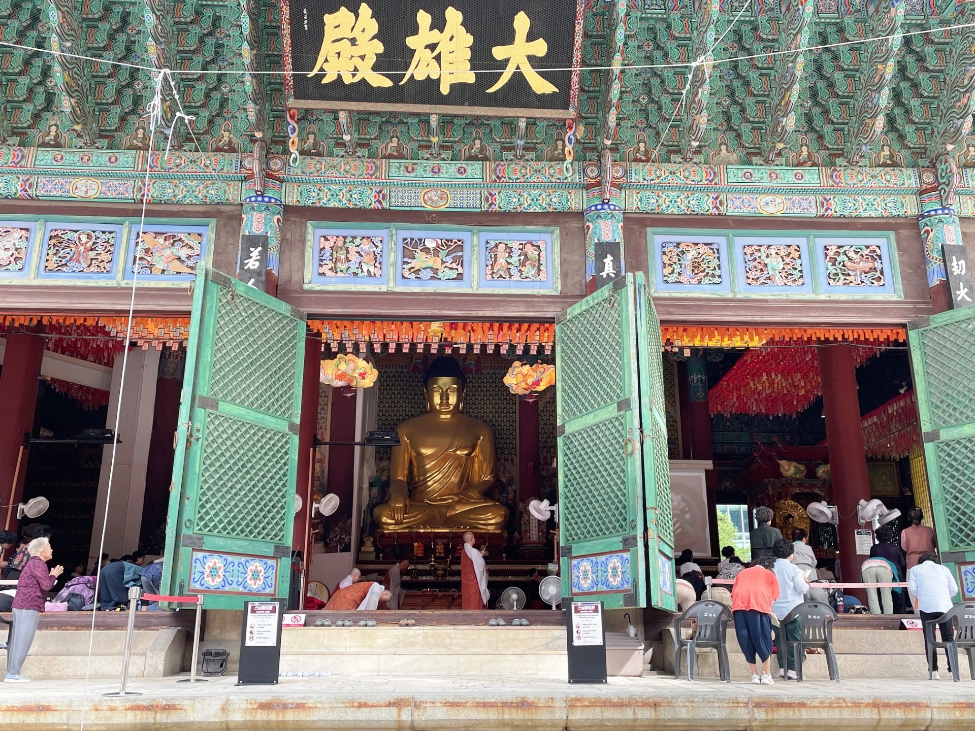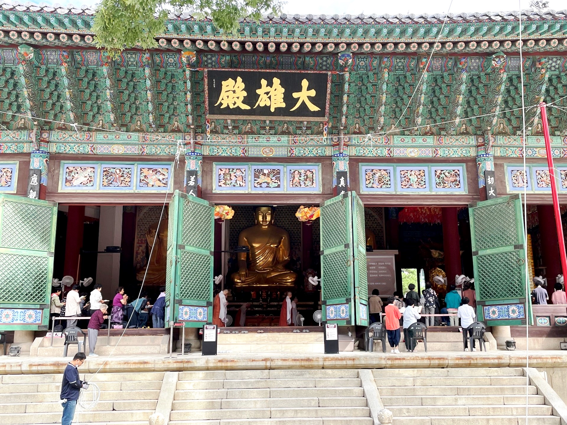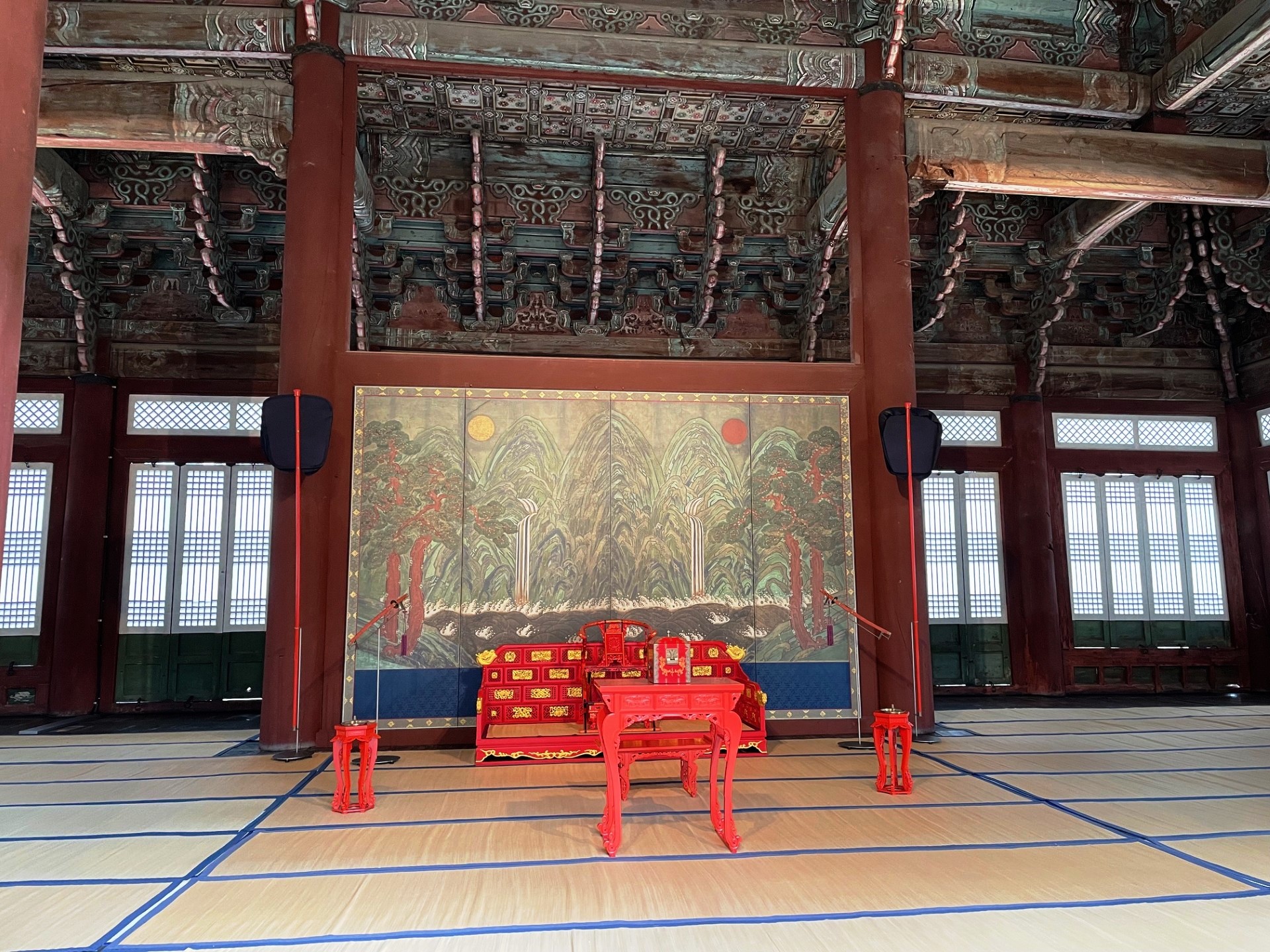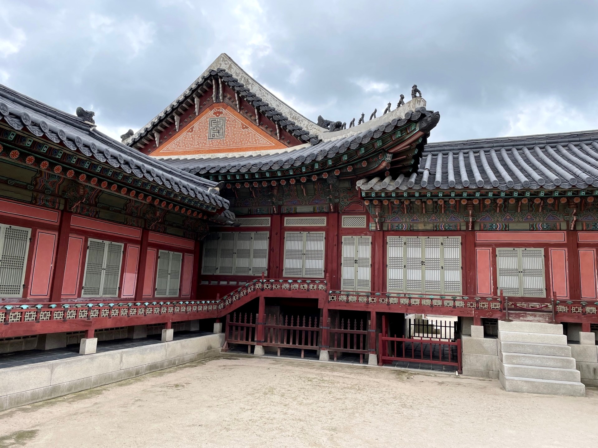 In the photo, the gate’s imposing stone base supports a graceful two-tiered wooden pavilion, crowned with traditional dark gray roof tiles that curve elegantly upward. The three red wooden doors symbolize royal authority and serve as the main passageways into the palace grounds. Above the central arch, a calligraphy plaque inscribed with the characters “光化門” (Gwanghwamun) proclaims its historical importance.