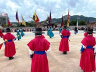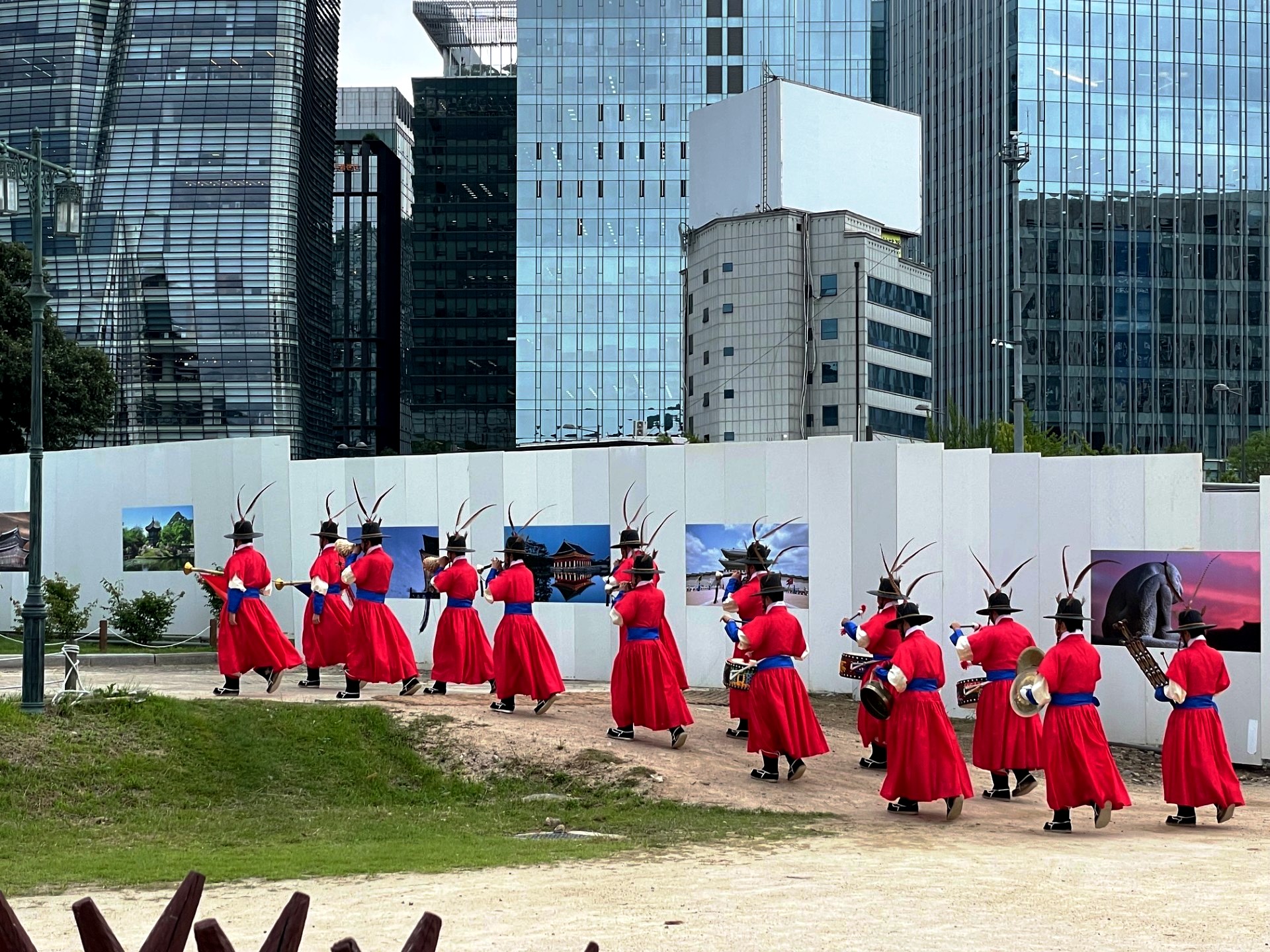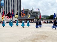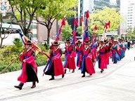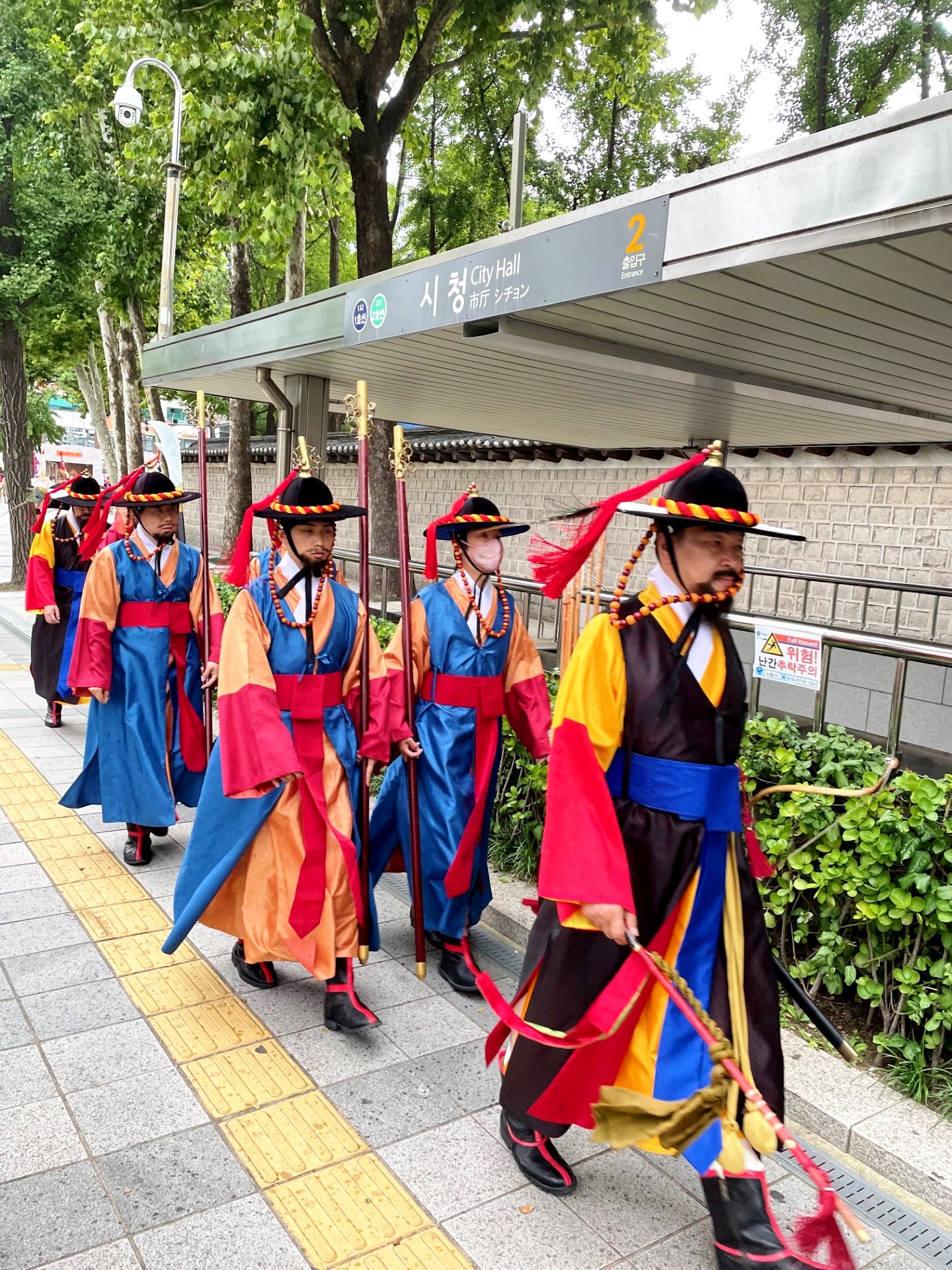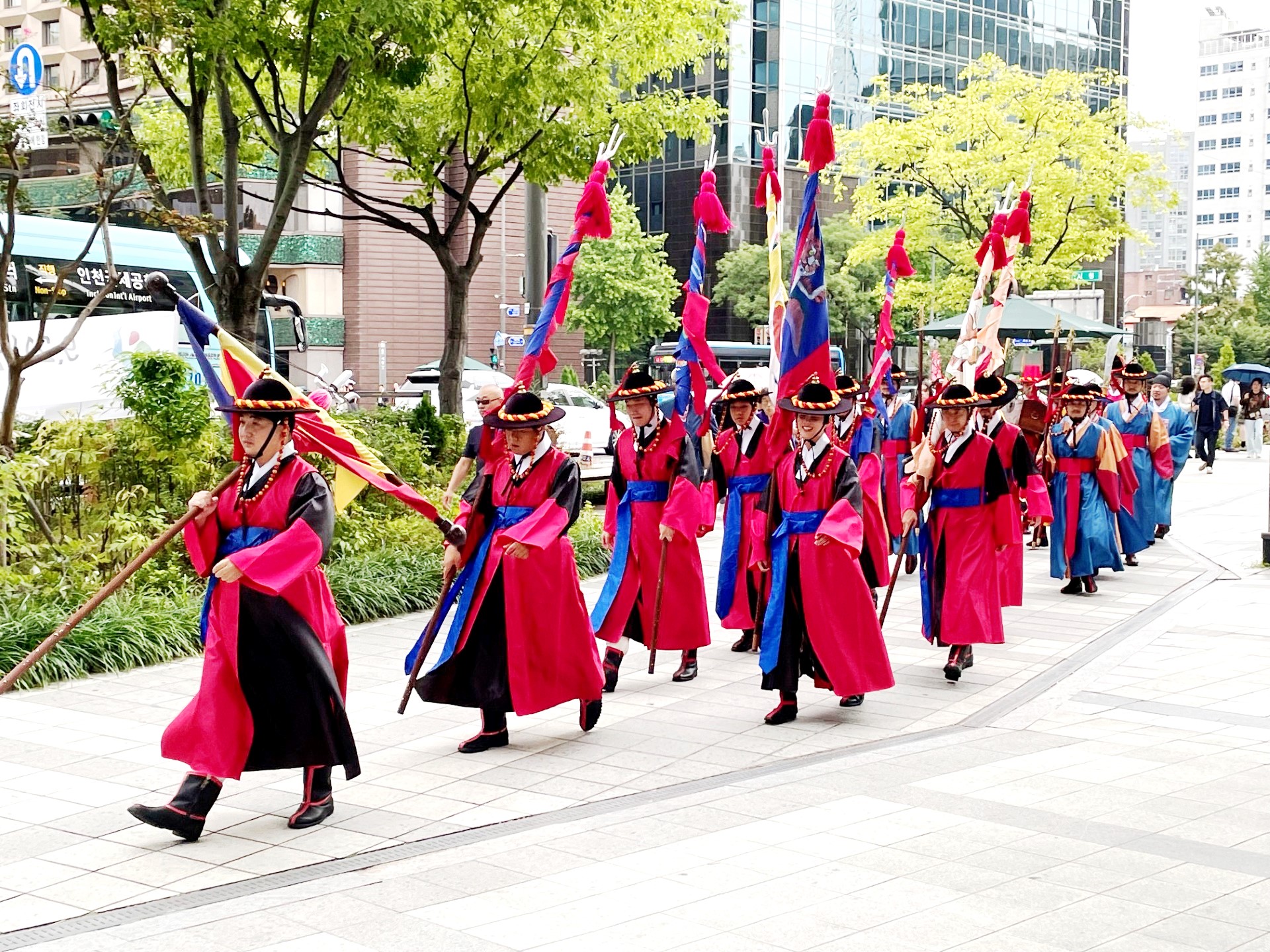 This photo captures a traditional ceremonial parade taking place on a city sidewalk in Seoul, South Korea. This looks like the Sumunjang Parade (수문장 행렬), where palace guards march from one site to another as part of a reenactment. It is a ceremonial performance held regularly in central Seoul to honor historical traditions. The participants are dressed in historical Korean guard uniforms, reminiscent of those worn by royal guards during the Joseon Dynasty. Their attire includes: