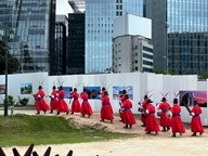 The surroundings show a clear contrast between tradition and modernity. The march is happening along a paved sidewalk lined with green trees. In the background are modern high-rise office buildings with glass facades, street signs, a tour bus, and pedestrians casually observing or walking by.