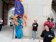 Many of them carry ceremonial spears or tall flags with bright patterns and tassels.